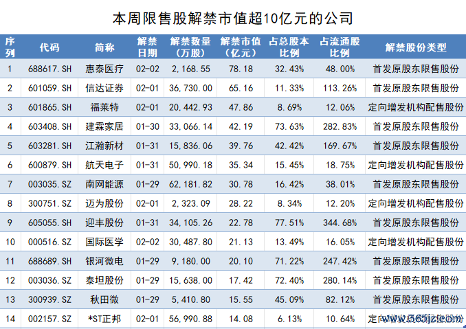 惠泰医疗是本周限售股解禁规模最大的公司。根据公告,公司2月2日有2168.55万股首发限售股解禁,占总股本比例的32.43%,约合解禁市值78.18亿元。