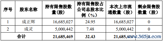 此次解禁股东共两名,为公司实控人成正辉、成灵二人。解禁筹码集中,解禁压力有限。