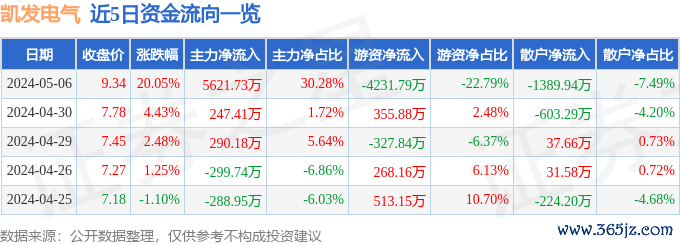 5月6日的资金流向数据方面,主力资金净流入5621.73万元,占总成交额30.28%,游资资金净流出4231.79万元,占总成交额22.79%,散户资金净流出1389.94万元,占总成交额7.49%。