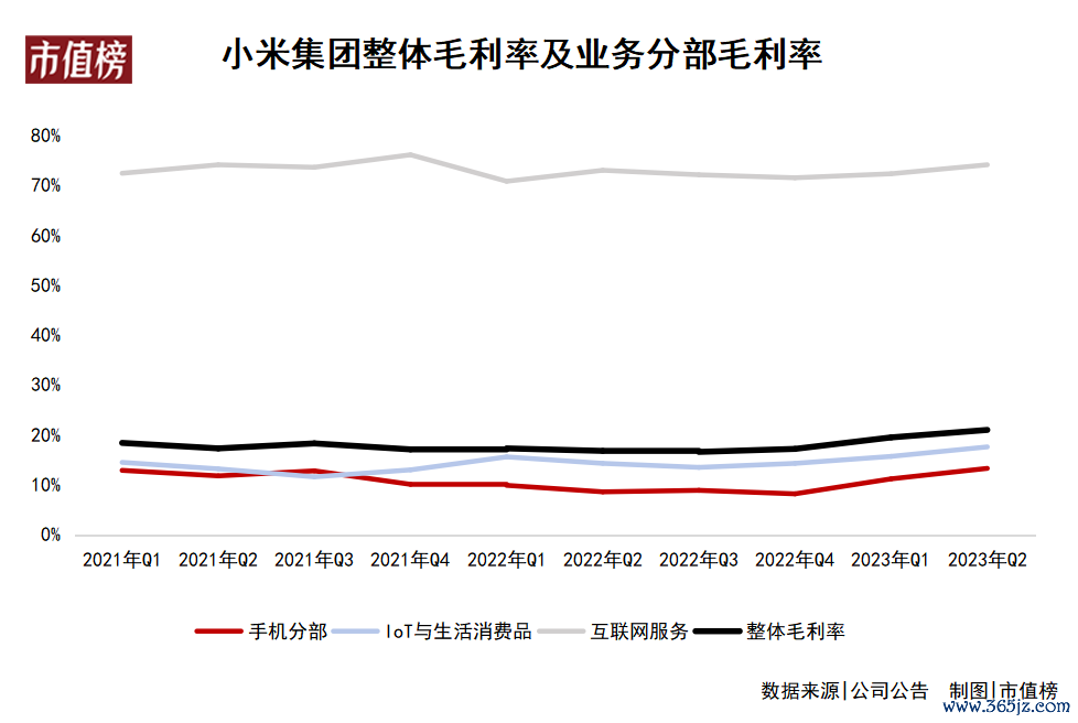 小米互联网业务毛利率一直保持 在70%以上,今年第二季度更是达到了74.1%,也与此有关。