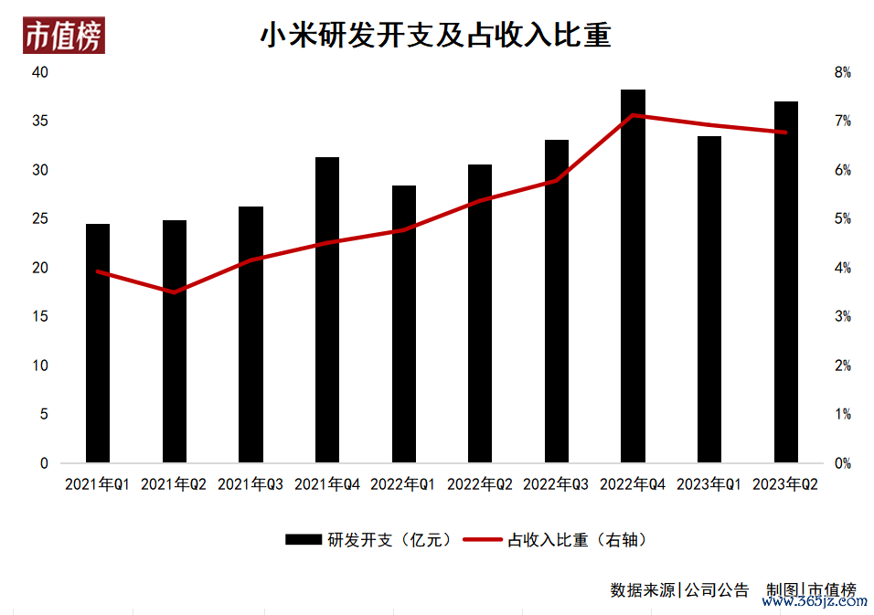 比如研发,上半年,小米的研发开支增长了19.4%,其中第二季度,研发支出同比增长21%到46亿元。