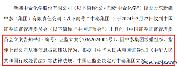 从消息层面来看,中泰化学3月24日晚间公告称,其控股股东新疆中泰(集团)有限责任公司(下称“中泰集团”)已被中国证监会立案。