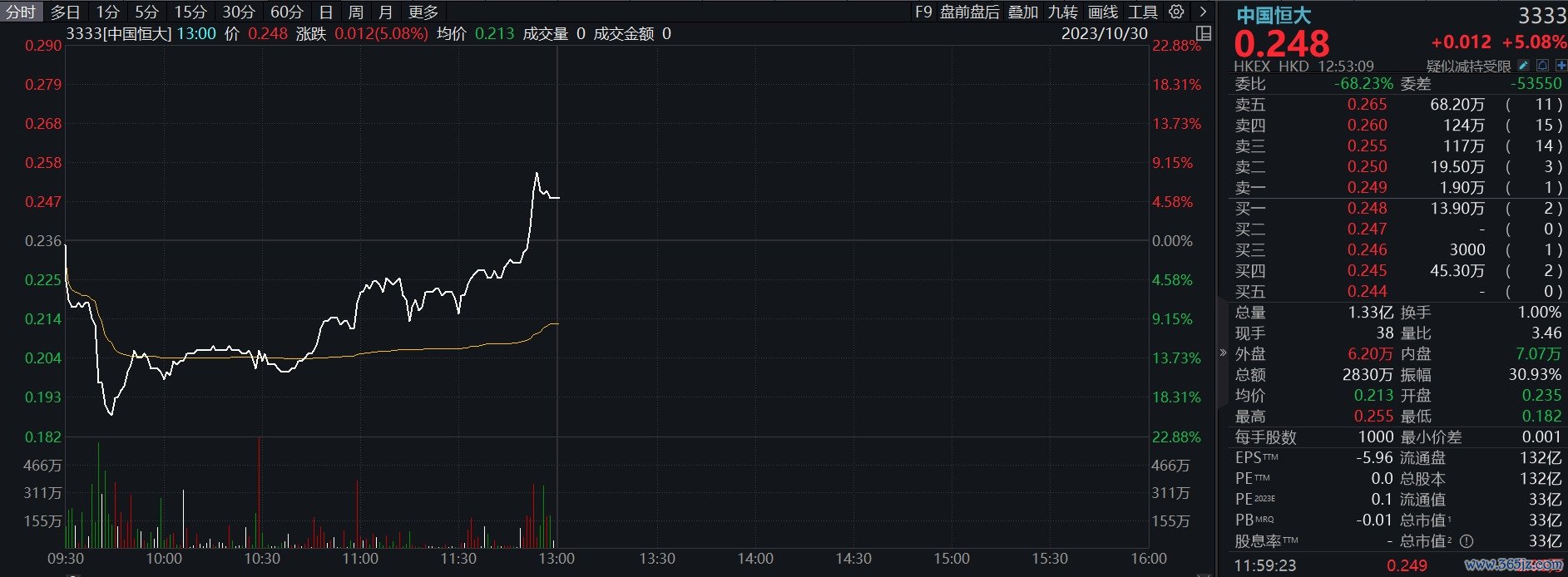 截至发稿,中国恒大涨5.08%,报0.248港元。