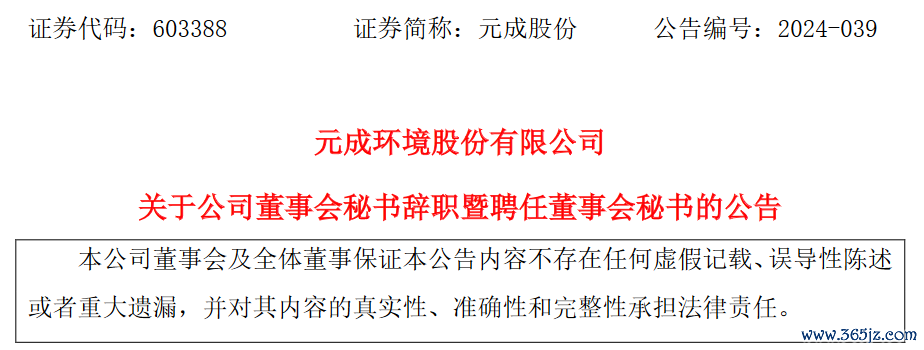 元成股份(603388)于5月9日发布公告称,元成环境股份有限公司(以下简称“公司”)董事会近日收到公司董事会秘书、副总经理柴菊竹女士递交的书面辞职报告。